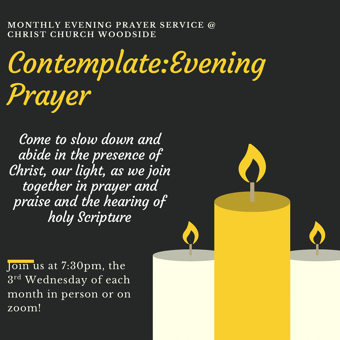 In this intimate service on the 3rd Wednesday of each month, we take time to intentionally slow down and abide in the presence of Christ through prayer. In this special evening prayer service, we highlight stillness in prayer, music, and mediation on Holy Scripture. In addition, we are excited to also offer a zoom option for those who are unable to join us in person at church. Join us on the third Wednesday of each month at 7:30pm for this special time to join our minds and hearts together with God through the gift of prayer!